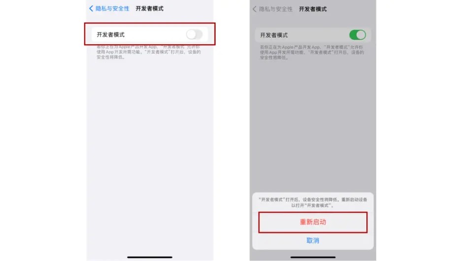 ios16-ios18安装引导,IOS16以下用户跳过点击【开发者模式】,并打开开关按键,按照提示确认“重新启动”,重启启动设备后,将会开启开发者模式。